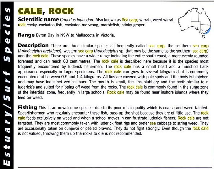 0 Linc 1 Posted May 29, 2014 (edited) This is from the book 'Australian FIsh Guide' http://books.google.com.au/books?id=JmN0rfM0V4IC&pg=PT83&lpg=PT83&dq=rock+cale+sea+carp&source=bl&ots=7pe6-_Q0BM&sig=ulrV9sSI6SImsr9zh6F39Qx7gcs&hl=en&sa=X&ei=Pt-GU5rxFMWolAWAtIGQCw&ved=0CDQQ6AEwAg#v=onepage&q=rock%20cale%20sea%20carp&f=false Edited May 29, 2014 by Linc Share this post Link to post Share on other sites