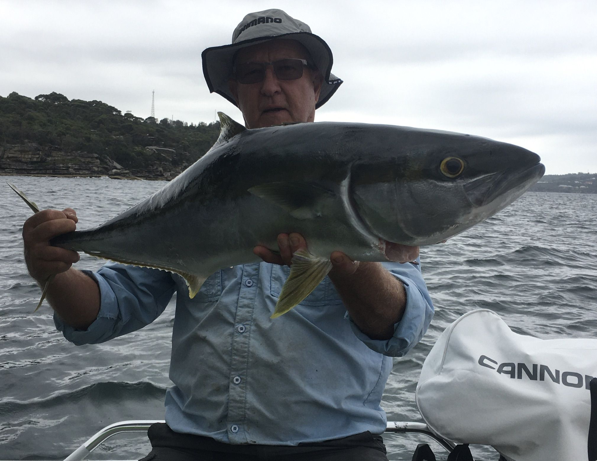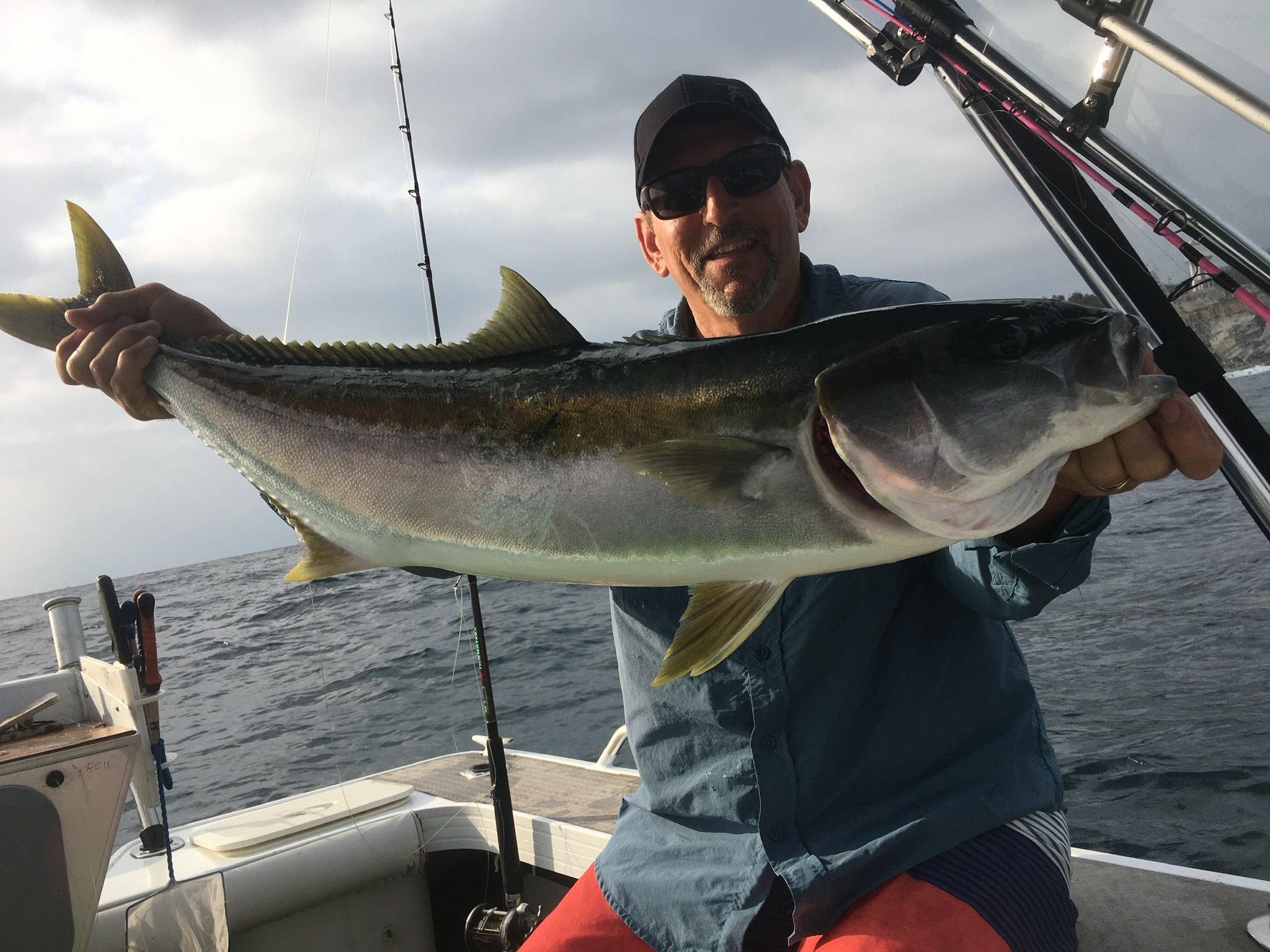 Pickles 252 Posted January 29 Yakkas were easy again today and again a perfect size. Squid a bit harder though, probably due wind chop. Water was 24.6 degrees at the heads and BIG Kingies came out to play in beautiful blue “fishy” water - so different to a few days ago when the water was grey. Within 20 seconds of putting the Minkota down and pot locking, a strip bait on 2/0 hook for slimies was monstered and the first Kingie stripped 30m of 15lb line in about 7 seconds, turned for the bottom and then the inevitable bust off - smoked. I upgraded to a 50 lb outfit on a small overhead with a livie bridled up and fed back in the burley trail and again - smoked. This time I had it on for about a minute and thought I was going to have a “metery” on board, alas again smoked on the bottom. I love Kingies - they fight hard and dirty and it’s uplifting when you get one onboard. Peter put out a livie on a big overhead and ugly stick on mono. The stretch saved the day and he boated a 94 cm hoodlum. Total Kingies for two days = 10, gotta love living in Sydney 12 Share this post Link to post Share on other sites